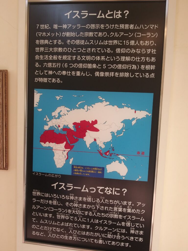 イスラム教についての説明も大人向けと子供向けに分かれてます。イスラム教は国境を越えた世界3大宗教の一つです。15億人も信徒がいるとは。入信するのは、男性信者の前で信仰告白すればなれるらしいが(・□・;)辞めるのは昔の部活の如く難しいみたいです。