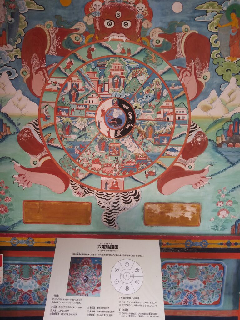 これは、チベット仏教の六道輪廻(ろくどうりんね)の図ですな。阿修羅さんらしき強面の方が掲げていて、迫力はあります。すべての生き物が行いによって生まれ変わるという六つの世界を示してます。天道(仏様のいる天国)や人道(人々が住む世界)、畜生道(動物さんの世界)、阿修羅道(戦の絶えない世界)、餓鬼道(満たされない空虚な世界)、地獄道(苦しみに満ちてる世界)が描かれています。何やら考えさせられる絵ですが、自分も死後は仏さまのそばに行けるように人に優しくしていけたらいいなあ。
