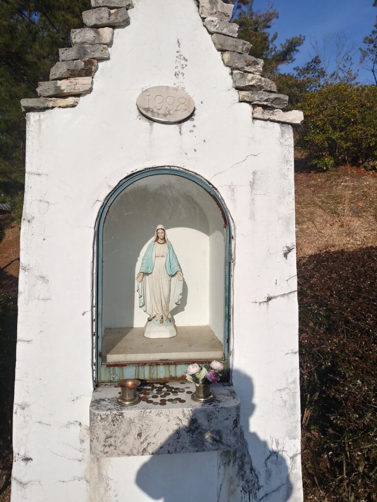 マリアさまが祀られてる祠です。両手を広げて、何者も受け入れる寛容なポーズ。キリスト教の祠なのに、お賽銭が投げ銭されてます。優しそうなお顔。この聖母は、社畜、ダメ社員やニートも受容して、情緒安定に資するようです。