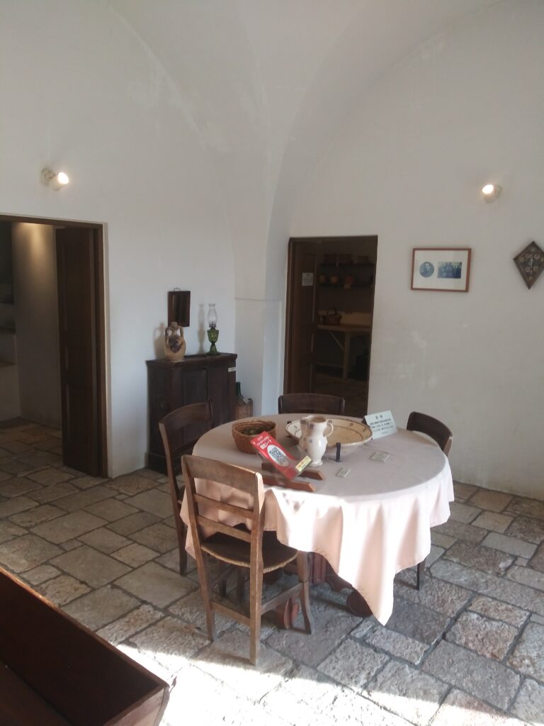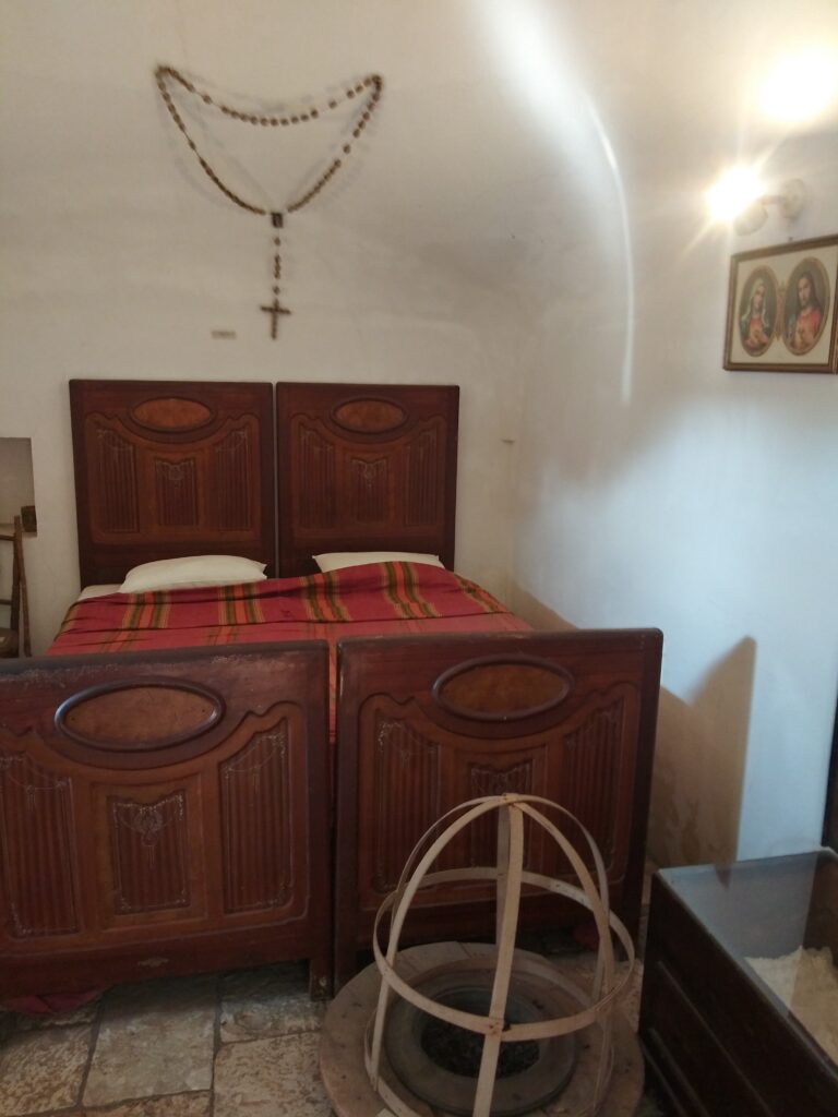 中の寝室です。寝室には十字架とキリストのイコンが飾られています。白の漆喰の壁があるのみですっきりしてますが、冬は寒くならないのでしょうか。まあ、地中海性気候なので心配なさそうです。