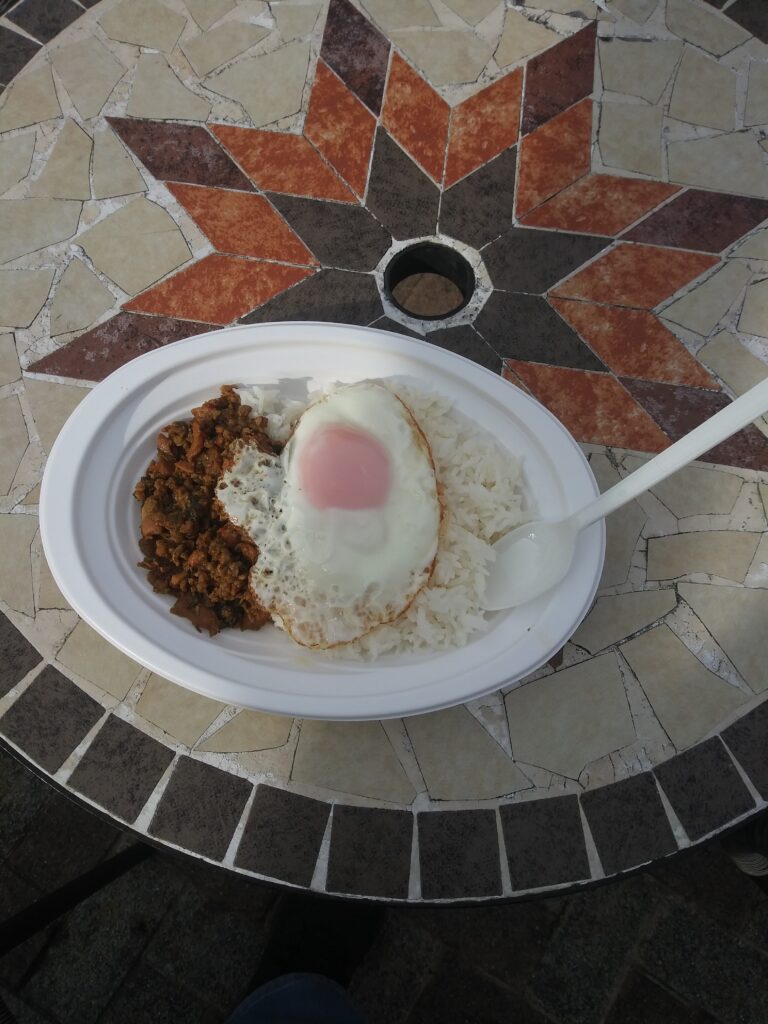 これは、タイのガパオライスです。こういった食べ物も販売してます。750円ほどしました。ややスパイシーでしたがエスニックで美味しゅうございました。お口に合いました。異文化交流は食文化から。