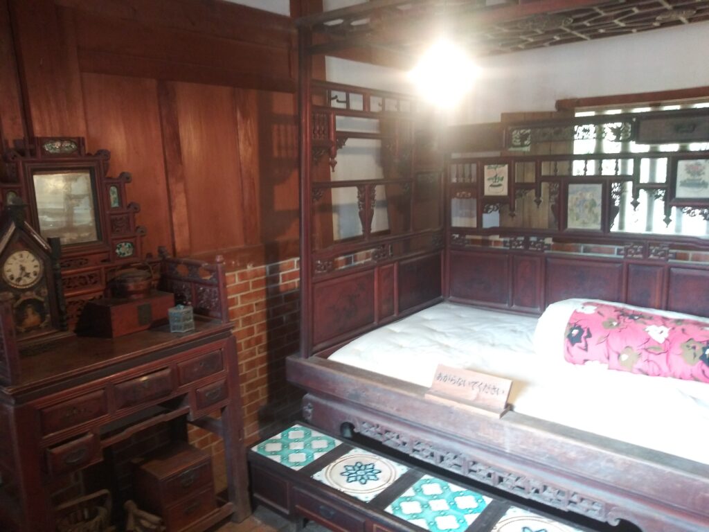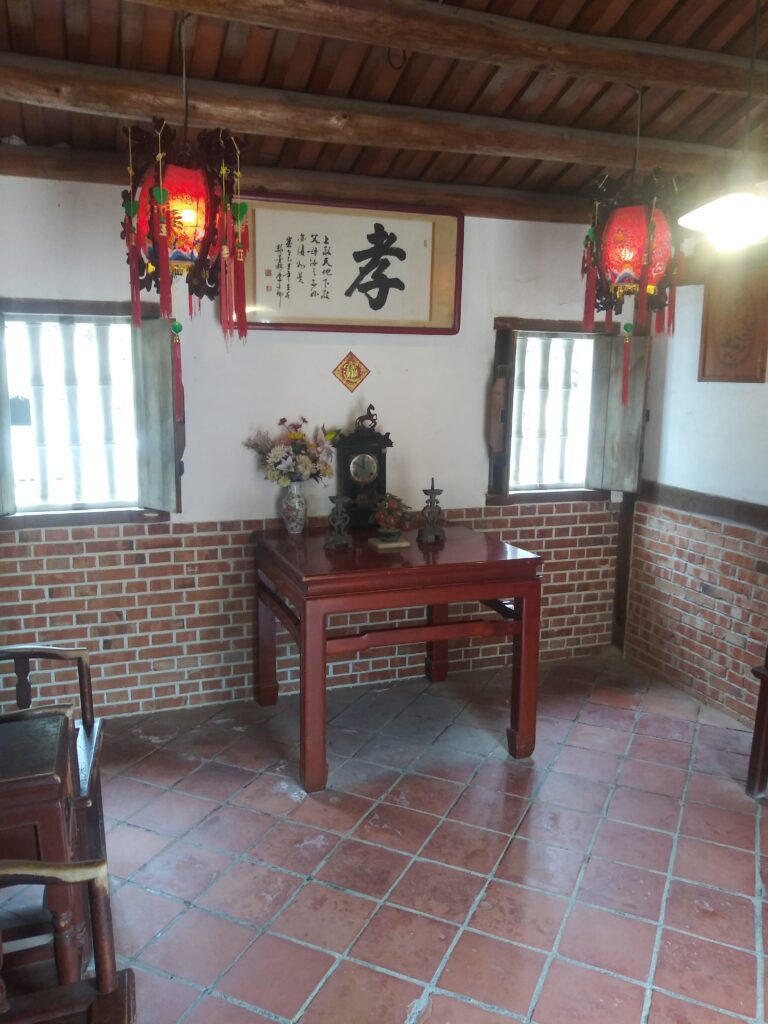 台湾の、昔の庶民の民家の中みたいです。木調ですが、アナログ時計やタンスなど西欧チックな物も混ざっております。