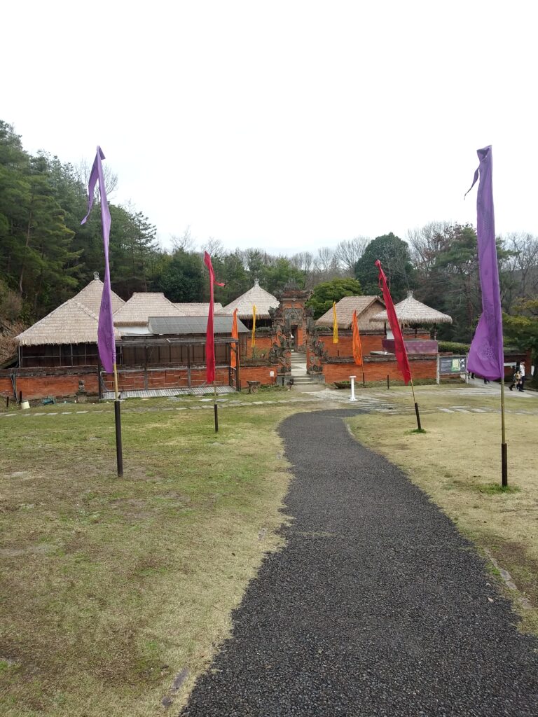 お次は、東南アジアの島国で、日本とも縁のあるインドネシアです。こちらの国、赤道をまたぐ熱帯の国です。個性的なお顔の門がお出迎え。昔の庶民のお宅、どんなものか。