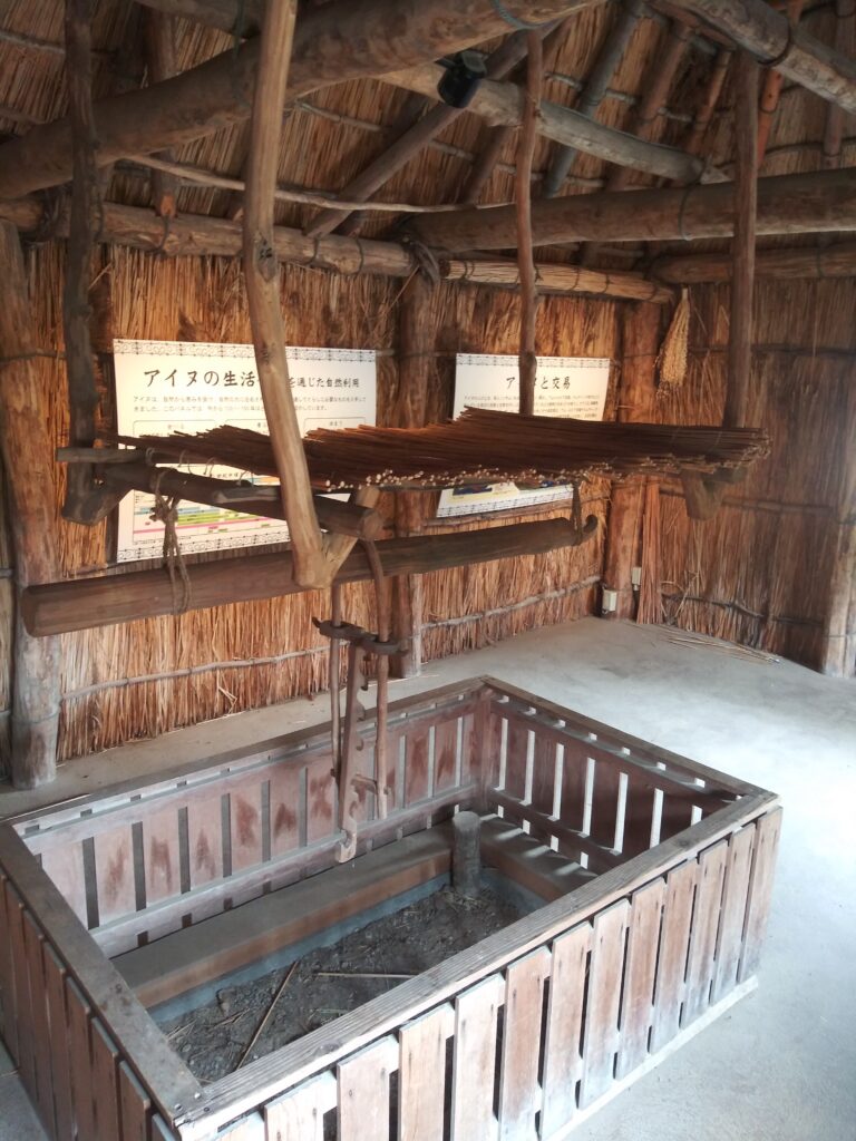 こちらは、南国石垣島の反対方角の北海道のアイヌ民族のおうちです。ゴールデンカムイのアシリパさんが住んでたかも。このおうちは、藁葺ですが、防寒性や保温性に優れた造りになってるのかしら。