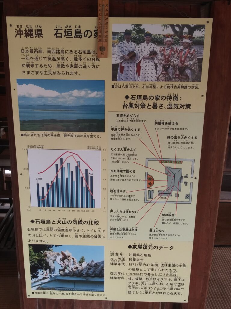 こちら、沖縄県石垣島に19世紀ごろあったおうちです。見事に復元されてます。リトルワールドでは、本土とは気候的に異なる沖縄のおうちも展示されてます。まずはこちらから品定めします