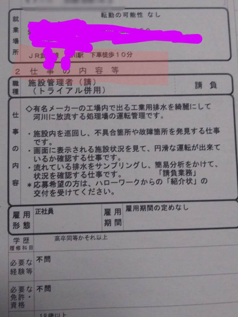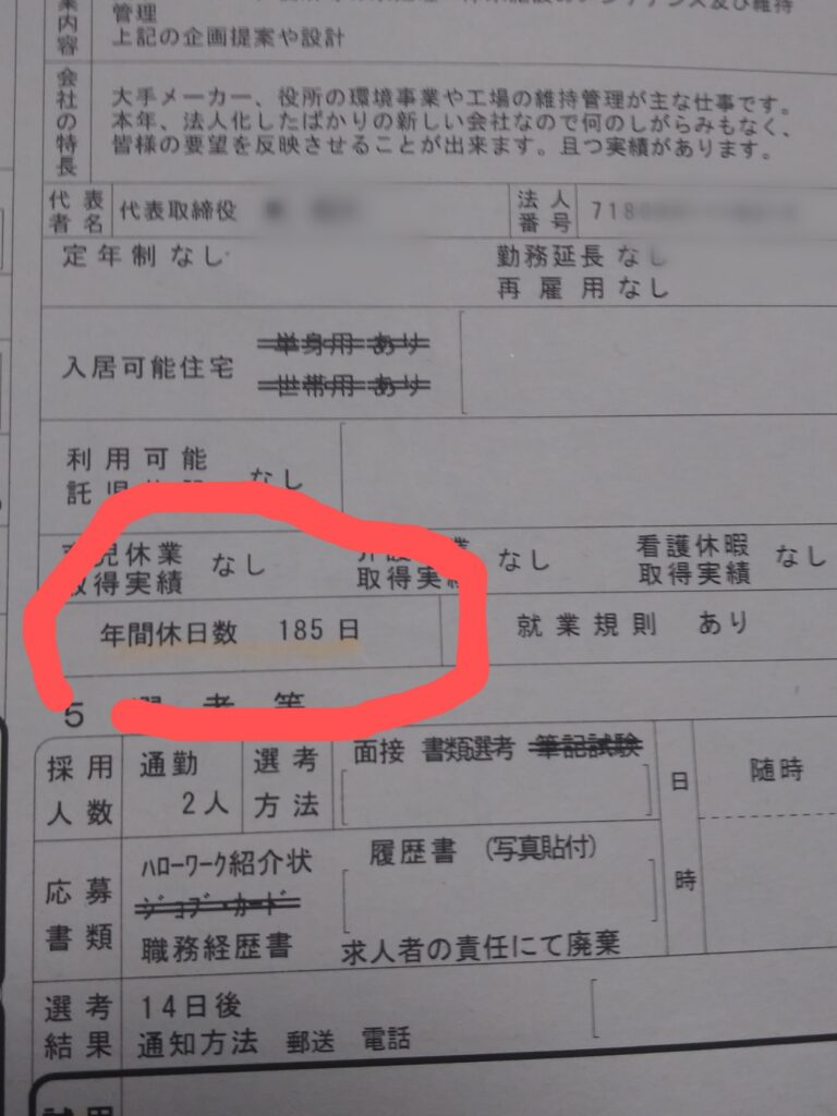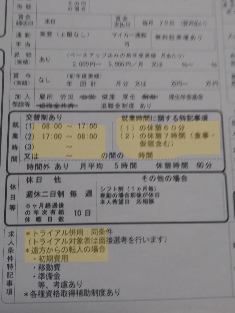 ハローワークの求人票にもその旨、記載されてました。黄色の蛍光ペンでマークしてあるところがその証。